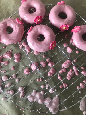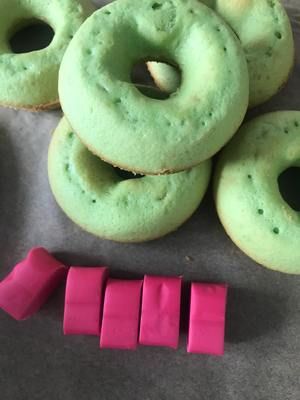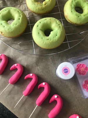 - siehe auf der Verpackung! Über die Donuts geben und seitlich mit Blumen dekorieren, das sollen die Flügel daratellen! Die Hälse hineinstecken und im Kühlschrank trocken lassen! Ich habe nur 6 Stück als Flamingo gemacht, den Rest mit Streusel bedeckt!