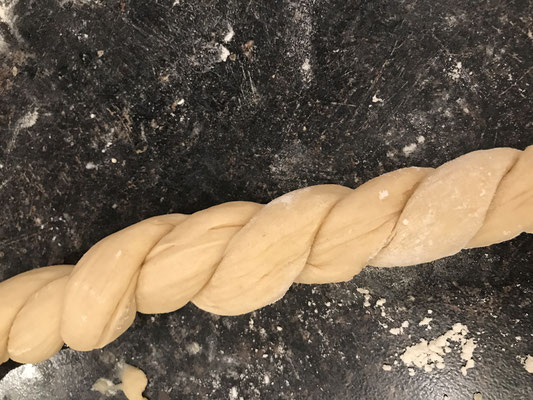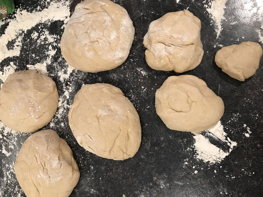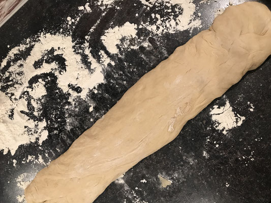 Soooooooo was jetzt ganz wichtig ist: den Teig nochmals durchkneten auf der bemehlten Fläche und immer wieder das Mehl auf der Arbeitsfläche ,,auffüllen"