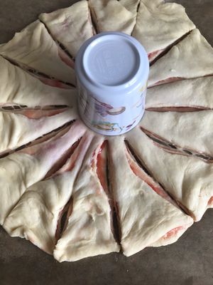 Nun ein Glas in die Mitte stellen und immer im 2er Verlauf Stücke anschneiden.