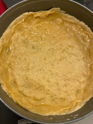 Den Teig aus dem Kühlschrank holen und ich nehme mir portionsweise Teigstücke und mach sie in meine Backform - den Boden und einen Rand! Finde das mit dem ausrollen und reinlegen zu klebrig ;-)