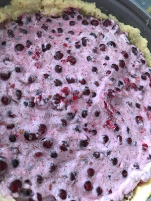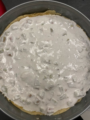 Diese Masse wir nun geteilt in zwei gleichgroße hälften! In die eine kommen die Haselnüsse oder Mandeln und der Rhabarber! Diese Masse füllt ihr in euren Boden und die andere Hälfte gebt ihr in einen Spritzbeutel mit Lochtülle und spritzt Tupfen auf. Man kann es aber auch einfach nur glatt verstreichen :-)