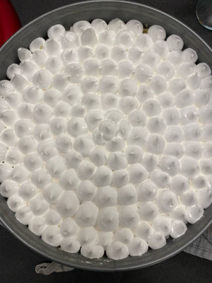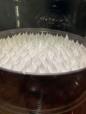 Das ganze nun 50 Minuten bei 150 Grad Umluft backen. Sehe ich der Baiser wird bräunlich, schalte ich nochmals herunter und verlängere das backen um 5 Minuten