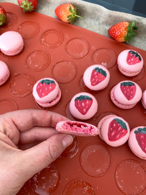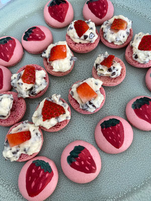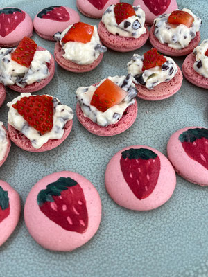 Etwas Creme auf den Macaron Deckel geben und die Erdbeere darauf „kleben“.