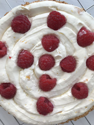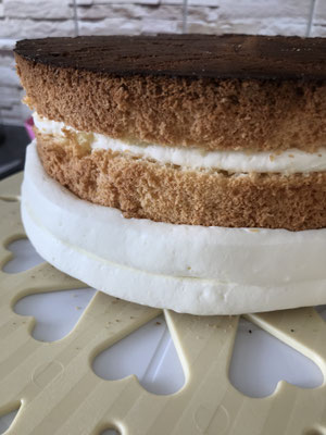 Böden 2x durschneiden und befüllen. Himbeeren hinein setzten und Boden drauf. Bis ihr damit fertig seid.
