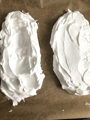 Zwei Rechtecke auf einem Backpapier zeichnen! Dieses nun umdrehen und ins Backblech geben!