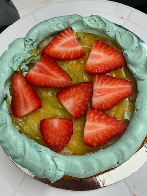 Mit der Buttercreme einen Rand des 1. Bodens spritzen. Dann den Boden etwas Marmelade bestrichen und die Füllung hineingeben, die Erdbeeren darauf, bis der Rand der Buttercreme erreicht ist.